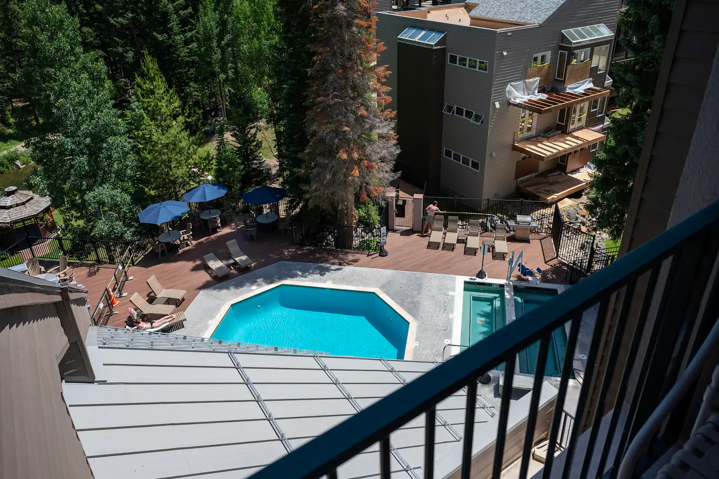 BREATHTAKING MOUNTAIN and POOL VIEWS Step onto your quaint balcony and soak in the stunning views of our sparkling heated pool. It’s the perfect spot to sip your morning coffee or unwind with a glass of wine as you watch the sunset over the mountains.